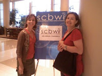 I had sushi this evening with Sara Lewis Holmes! A conference-goer kindly took our picture here by the SCBWI sign with Sara's cell phone.